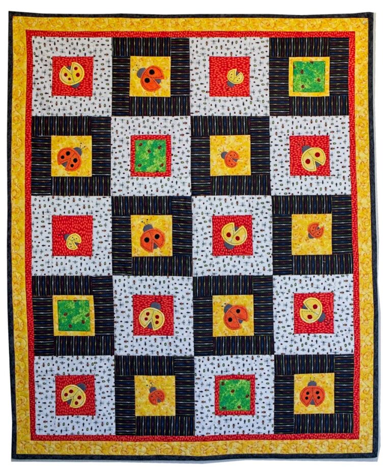 There were only four green squares with tiny ladybugs, but they fit right into “Going Buggy.” It used up a print of lots of tiny bugs, and gave me a chance to applique one of my favorite subjects–ladybugs.