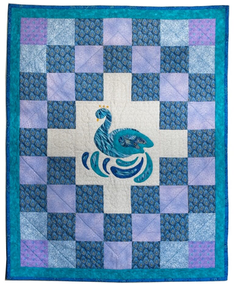 The 24 squares of feathers set the theme for “Sitting Pretty Peacock.” I had fun designing the peacock applique, and it was my first try at free-motion quilting feathers in the central medallion.