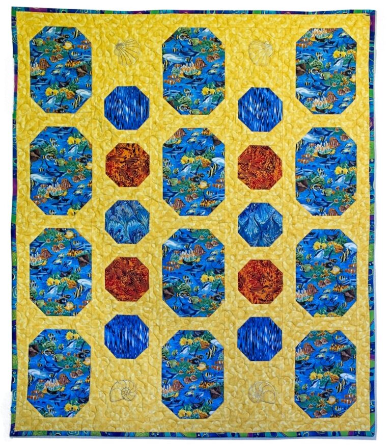 A few bright orange batik squares were left, and they spilled over into “Under the Sea,” along with some blue squiggly ones.